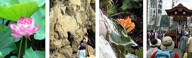 1:江戸期の園芸種、八重の蓮 2:小坪の崖の上にスカシユリ発見(画面上端) 3:望遠で撮りました 4:ちょうど漁港の祭に遭遇
