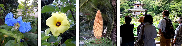 1:友禅の下絵に使うツユクサの仲間オオボウシバナ 2:和製ハイビスカス?のハマボウ 3:甘い匂いを放つソテツの雄花 4:光明寺庭園でひといき