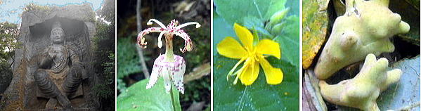 写真1:鷹取山山頂の磨崖仏 2:ユリ科のヤマホトトギス