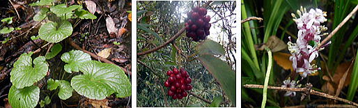 写真: ワサビの葉 ツルが整髪料として利用されたサネカズラの実 吉祥草の花