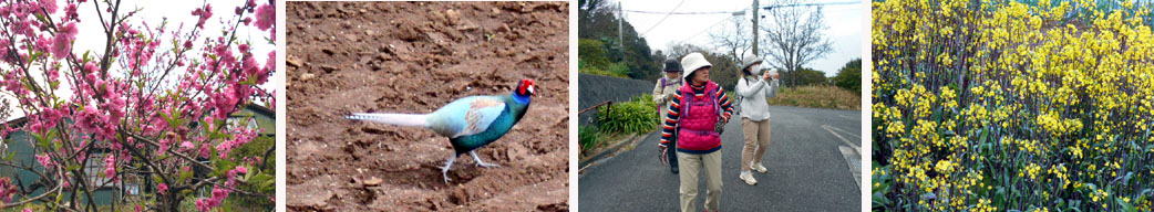 写真1桃の花 2雄のキジ 3参加者の皆さま真 4アブラナ科の野菜コウサイタイの花