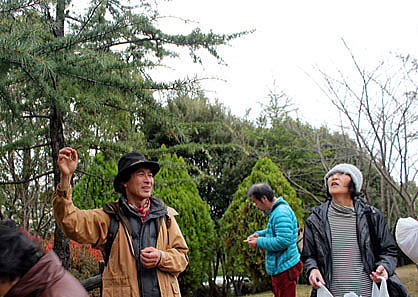 計画的に植栽されているので、樹木と野鳥の関係を解説しながら公園や通り、野鳥遊園を歩きました