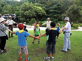 ゲームなどのプログラムを楽しみました。お父さんたちがはまったのはいろいろな葉っぱで創るクラフト。最後は輪になって定番の