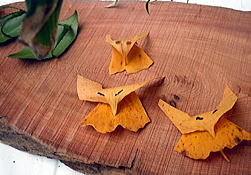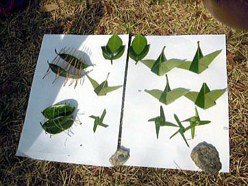1.小枝の矢印を追って、さあ! 森の宝さがし 2.集めた木の葉で手裏剣、鳥、虫かごを制作、