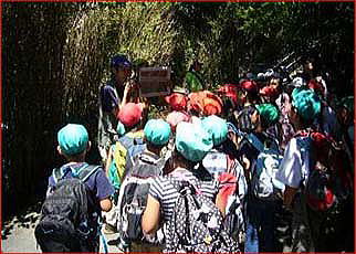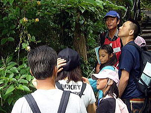 5班に分かれてインストラクターと一緒に自然探しのビンゴ。珍しい昆虫を発見したり、クワの実を食べたり、コショウのにおいの