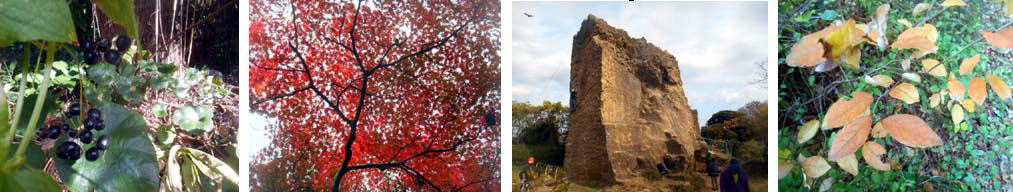 1和製アスパラガス? シオデの実 2神武寺のイロハモミジ 3、鷹取山山頂の切り立った岸壁 4、葉っぱが香る、ヤマコウバシの紅葉